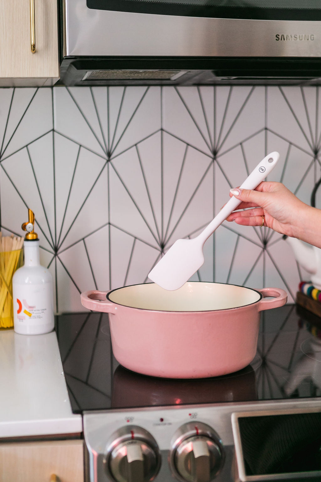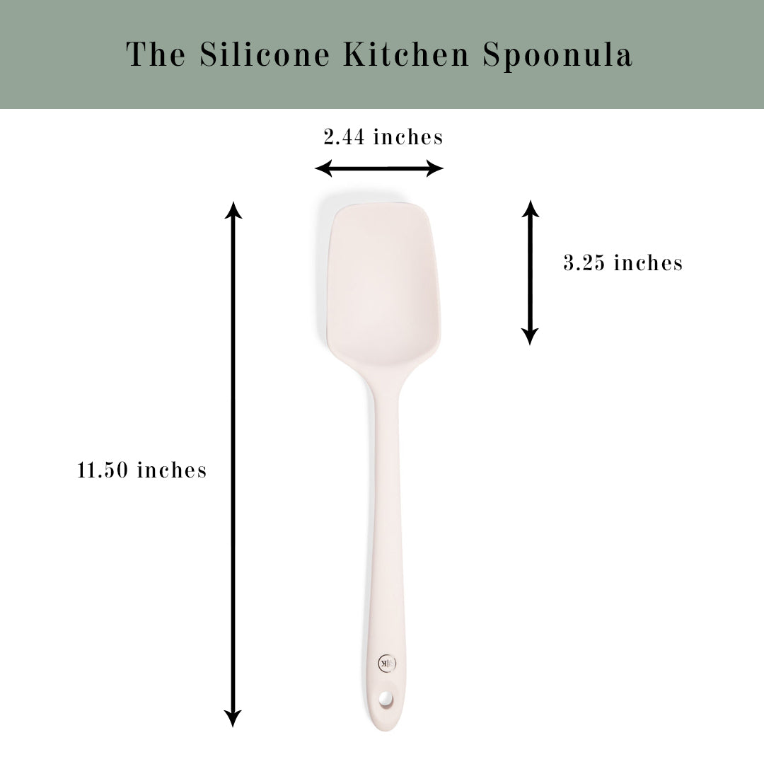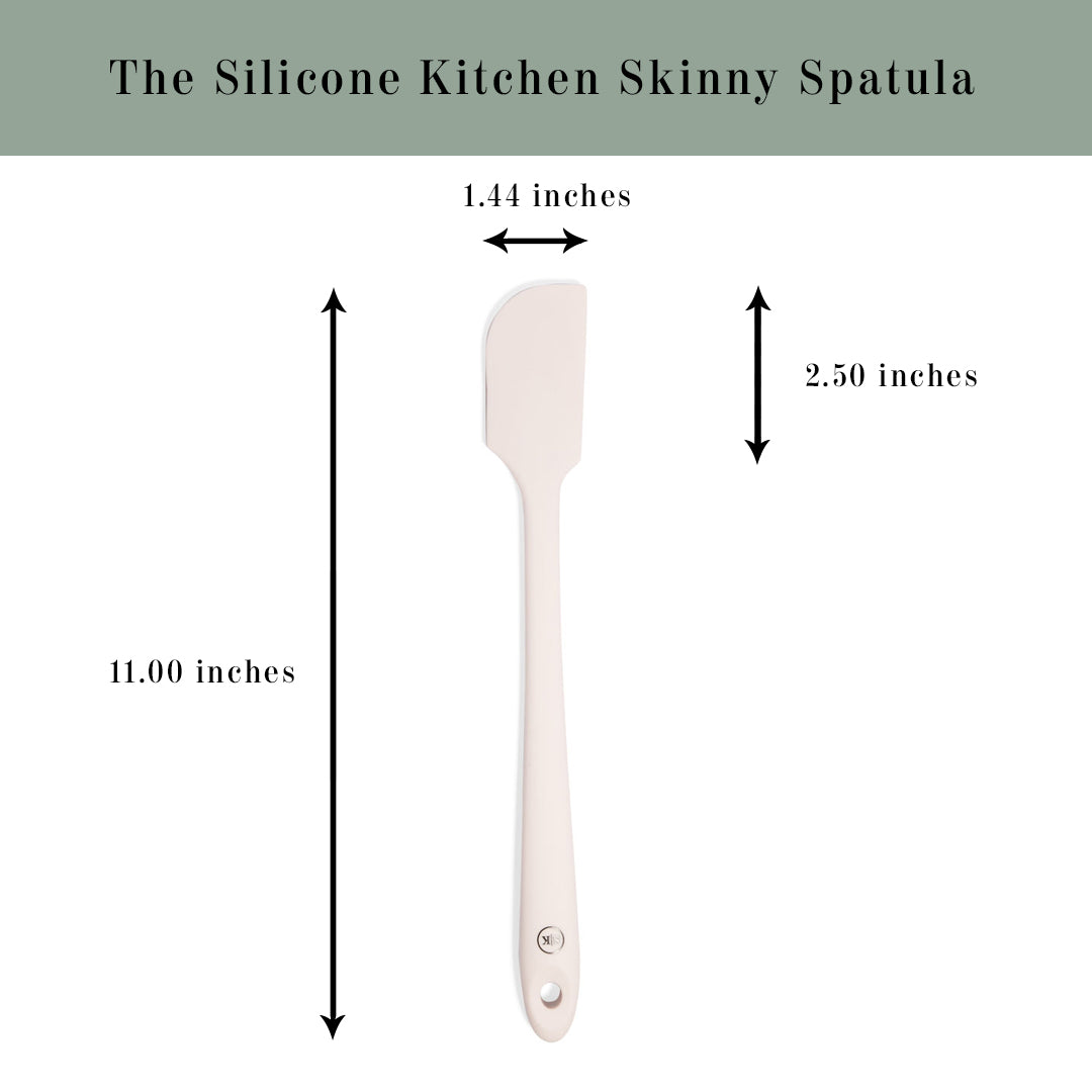 The Silicone Kitchen 3-piece Silicone Spatula Set includes kitchen must-haves, Standard Spatula, Skinny Spatula and the versatile Spoonula in a designer white color designed to be as functional and beautiful as your kitchen. Your The Silicone Kitchen standard spatula is your all-purpose kitchen tool when it comes to cooking and baking. The The Silicone Kitchen skinny spatula is ideal for those hard to reach corners of your jars and small containers to make sure you get every last drop. While The Silicone Kitchen spoonula is the kitchen utensil you never knew you needed, excellent for cooking liquid and semi-liquid on the stovetop and spooning dollops of deliciousness.These three spatulas come in the signature The Silicone Kitchen cotton reusable bag - great for saving on paper/plastic at the grocery store and trips to the farmer's market and, of course, storage.