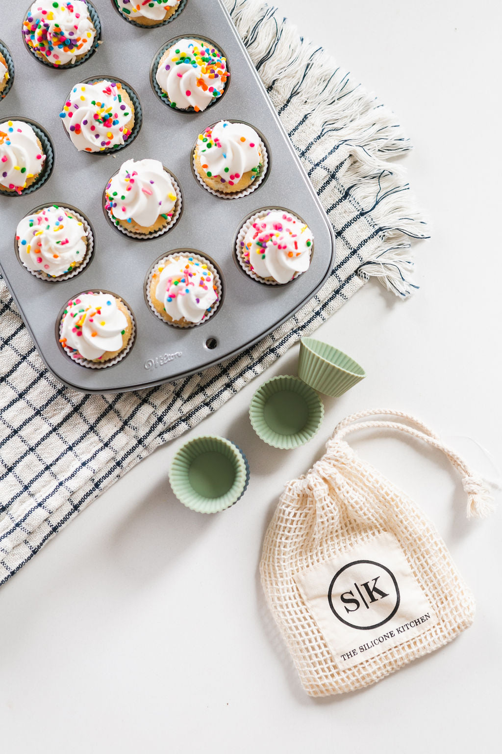 Reusable silicone baking cups are great for baking, treats, children’s snacks and lunches, sorting non-food items, crafts and more! Save money and headaches by avoiding single-use paper liners and cleaning the nooks and crannies of a muffin tin. These non-toxic, BPA free, 100% food-grade silicone baking cups are easy to clean, microwave, dishwasher, and oven safe (up to temperatures of 445 degrees Fahrenheit, 230 degrees Celsius
