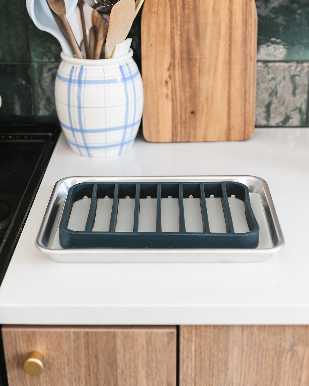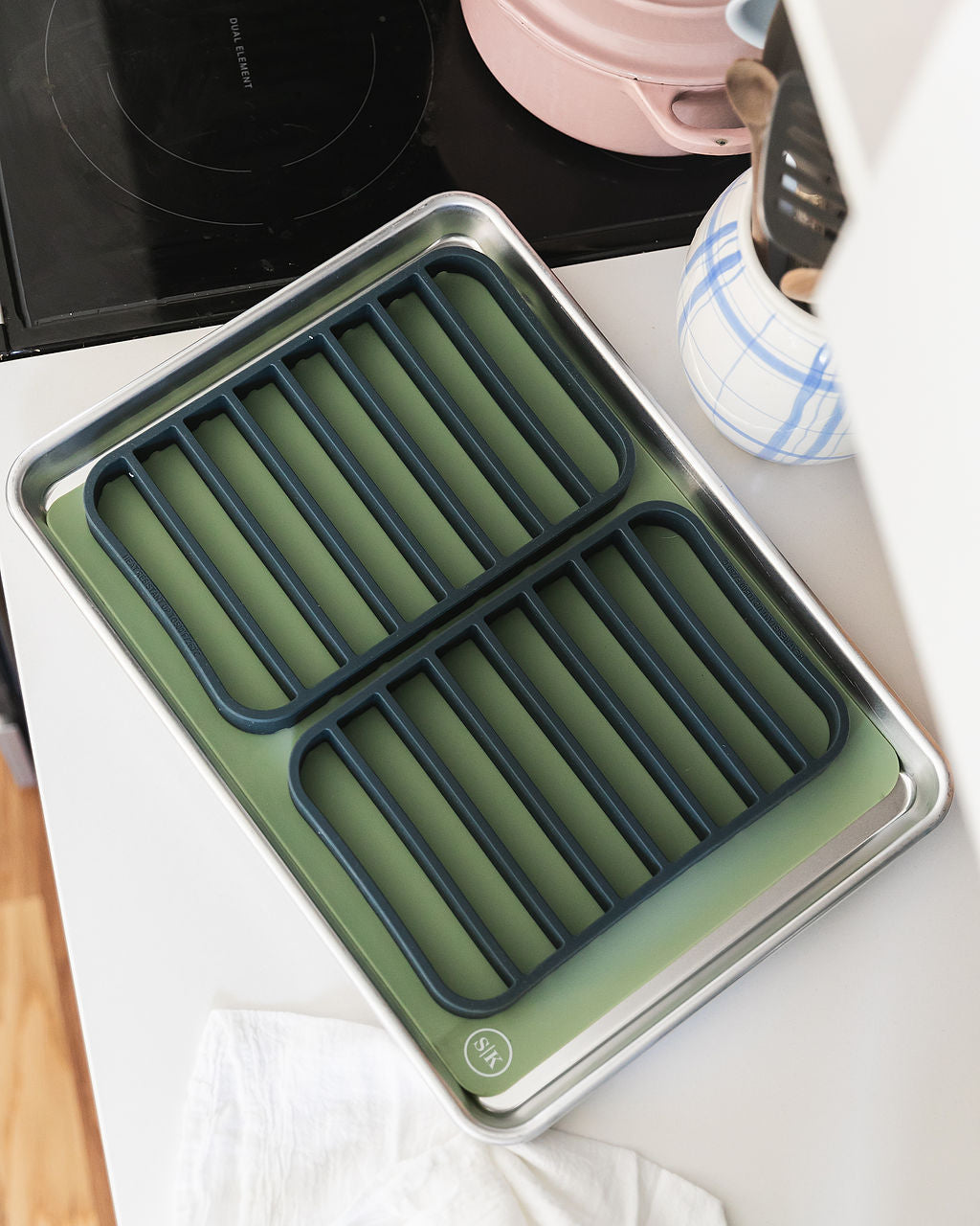 INCLUDES: Two heavy-duty silicone roasting racks in Vintage Navy, made of non-toxic, 100% food-grade, BPA free silicone packaged in a gift-worthy signature The Silicone Kitchen reusable cotton mesh produce bag