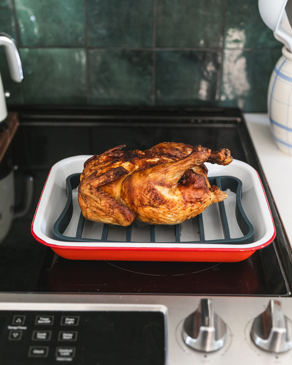 The Silicone Kitchen silicone roasting racks are the ideal kitchen accessory for roasting chicken, meat, vegetables and more in the oven, on the stovetop, or in the microwave. The innovative design promotes ideal air circulation for evenly cooked meals, and drains grease and fat away from the food. The set of two non-stick, BPA free, 100% food-grade silicone roasting racks are flexible and versatile. Use just one rack to fit a quarter-sheet size baking sheet or baking pan, or combine the two roasting racks together to get full coverage of a half-sheet baking sheet. The Silicone Kitchen silicone roasting racks are heat resistant up to 500°F (260°C), making them suitable for nearly every cooking or baking need. Even better, clean up is a breeze. The non-stick roasting racks prevent food from getting stuck on the roasting racks – no more scrubbing small metal wires, and you can also throw them in the dishwasher, ready to be reused again and again. Compact and lightweight, The Silicone Kitchen silicone roasting racks are easy to store over traditional wire roasting racks, and come with the signature The Silicone Kitchen reusable mesh produce bag, which can be used for storage or for your next trip to the butcher or farmer’s market.